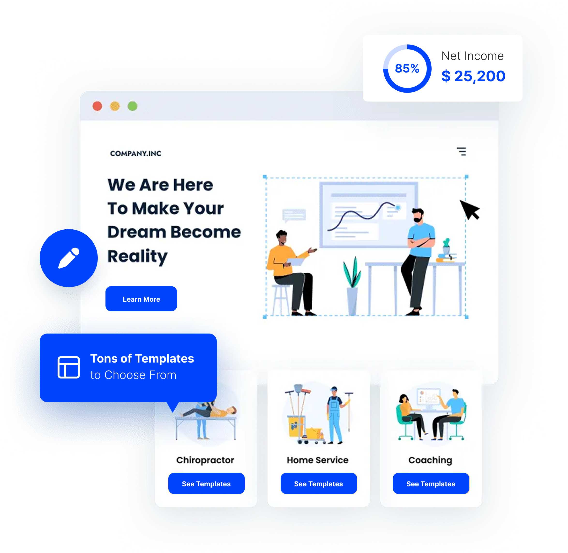 Easily create a custom website without any design or development experience.